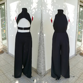 EN: The jumpsuit is described as close-fitting through bodice with open back, buckled back band, stand-up collar and exposed separating zipper closure. Semi-fitted pants on jumpsuit have back-welt and side-front pockets and invisible zipper closure.